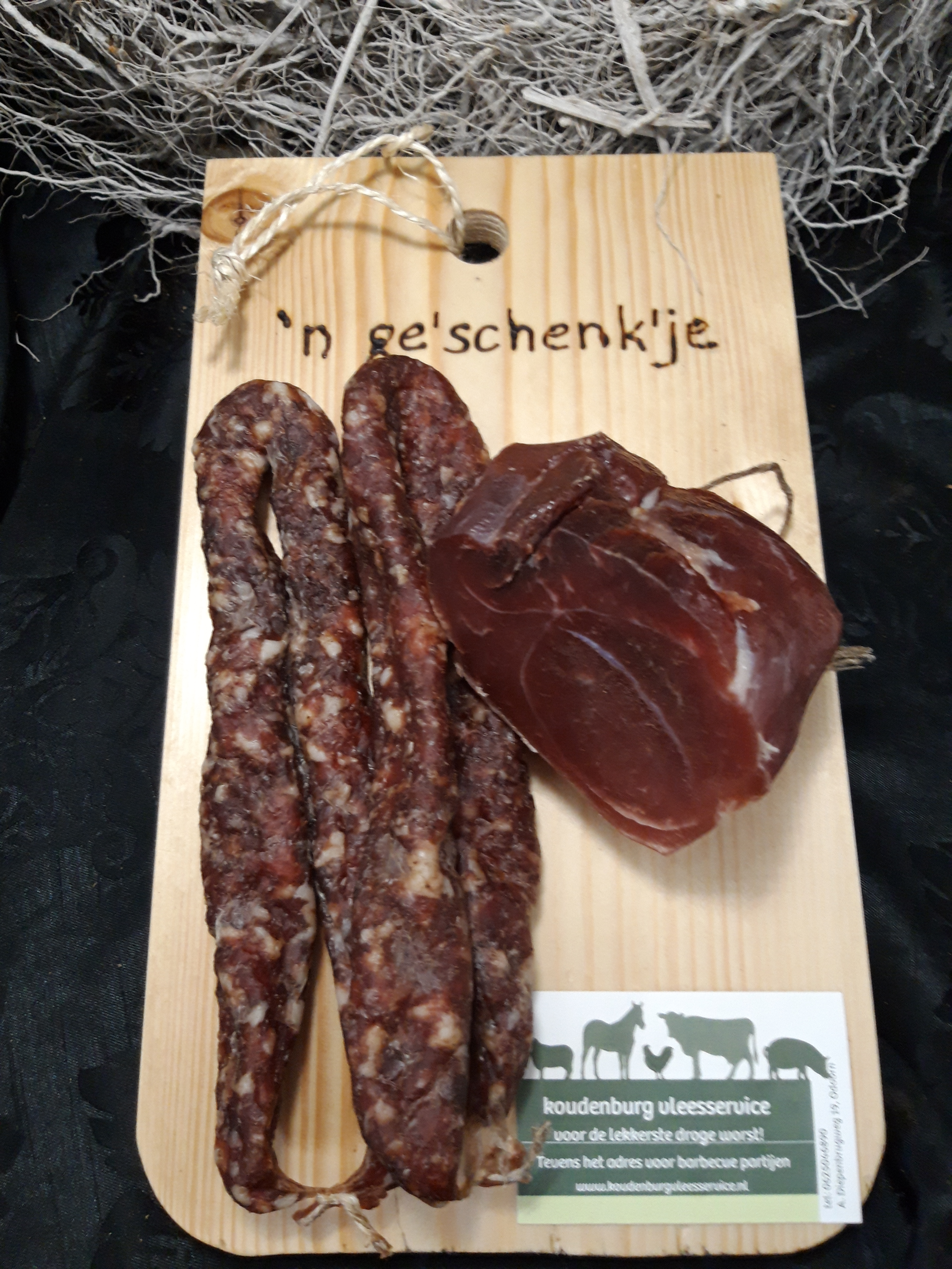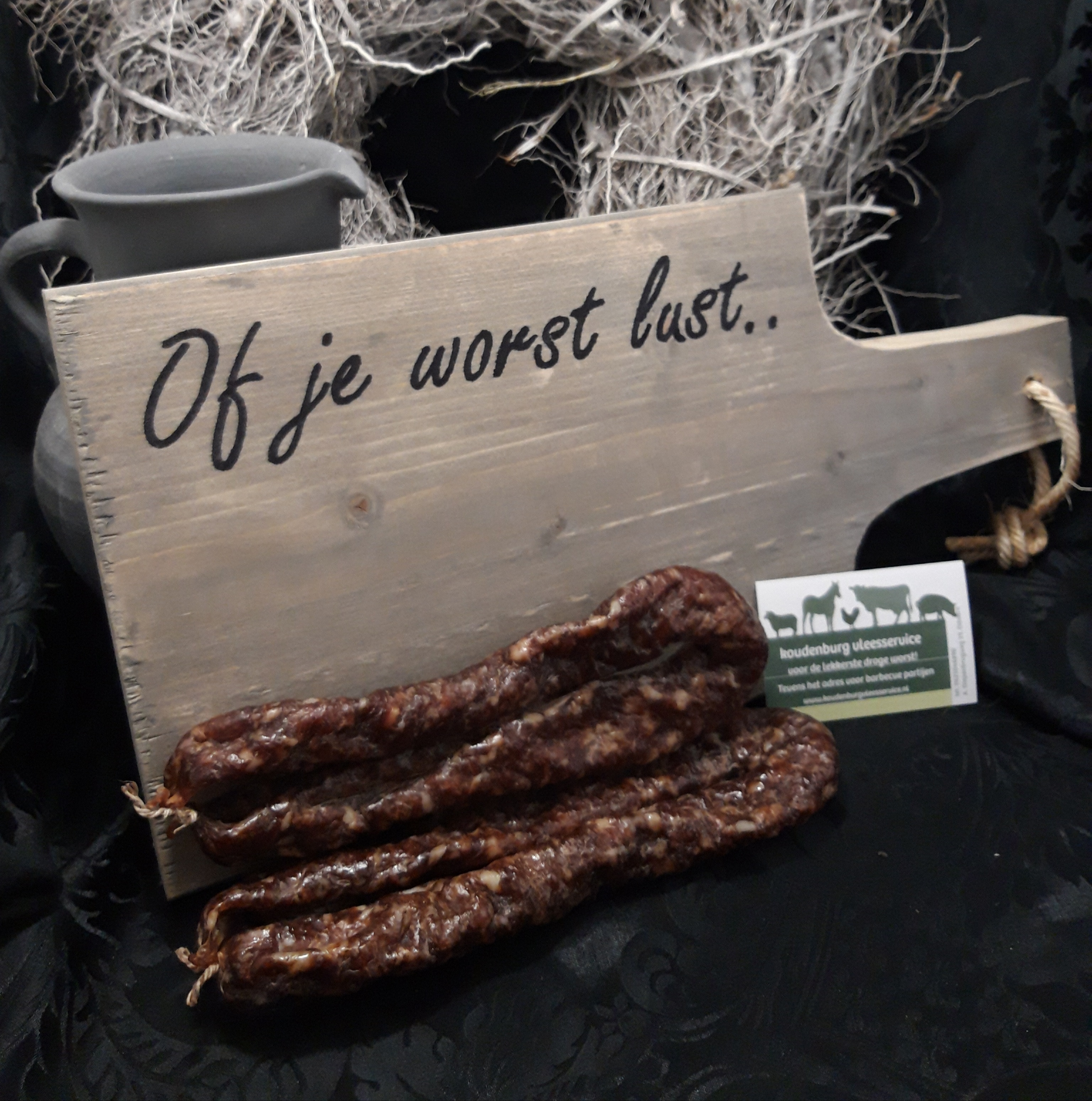 Wij verkopen cadeau artikelen. Leuk voor verjaardagen, of zomaar om iemand mee te verrassen. Een plankje met de tekst: “of je worst lust” met een tweetal gevacumeerde Drentsche droge worsten.