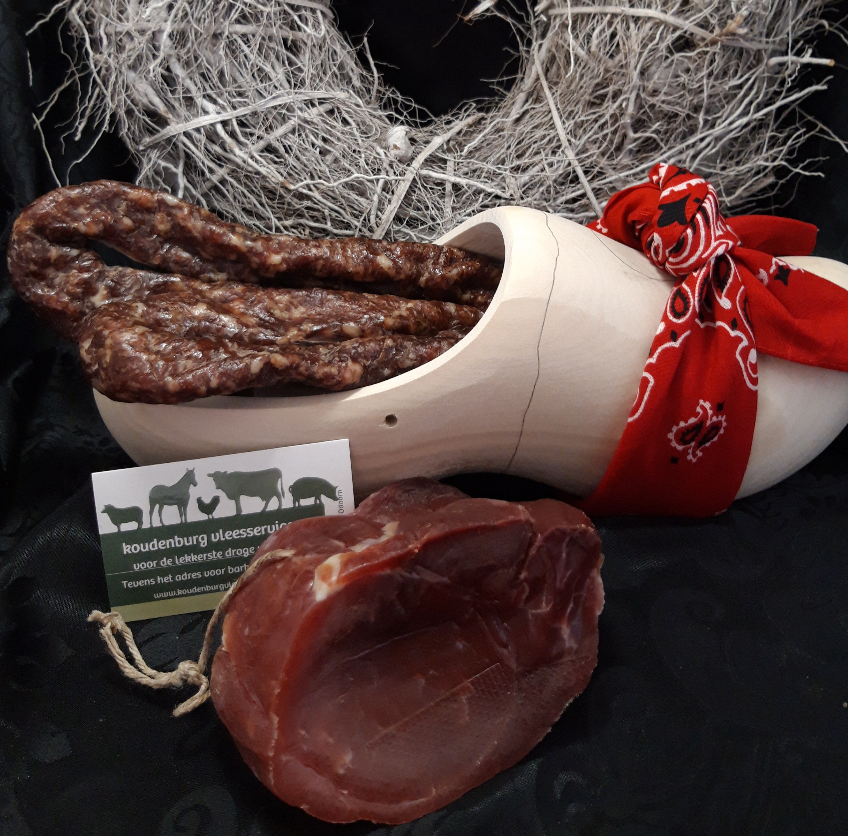 Een boerenklomp met een boerenzakdoek, twee droge worst. (ook mogelijk met schenk of nagelholt) en van de klomp kan een vogelhuisje gemaakt worden. Het vlees naar keuze is gevacumeerd en vandaar lang houdbaar!